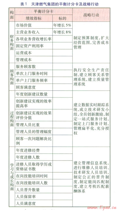 Kaplan與Norton認(rèn)為,組織在建立了高瞻遠(yuǎn)矚的愿景,確定了已達(dá)成共識(shí)的戰(zhàn)略主題后,如果沒(méi)有相應(yīng)的績(jī)效指標(biāo)來(lái)衡量戰(zhàn)略實(shí)施的效果,那么戰(zhàn)略往往會(huì)成為一紙空談。因此,在戰(zhàn)略地圖中展示的戰(zhàn)略性衡量項(xiàng)目需要用一些績(jī)效指標(biāo)來(lái)衡量,才能更好地對(duì)戰(zhàn)略加以實(shí)施。天津燃?xì)饧瘓F(tuán)的平衡計(jì)分卡及戰(zhàn)略行動(dòng)見(jiàn)表l,由于績(jī)效指標(biāo)的標(biāo)的會(huì)隨具體情況而調(diào)整,因此僅舉例說(shuō)明。表l展示了4個(gè)構(gòu)面,從戰(zhàn)略主題轉(zhuǎn)化為可操作的戰(zhàn)略行動(dòng),再依靠績(jī)效指標(biāo)衡量戰(zhàn)略行動(dòng)是否能夠達(dá)成,戰(zhàn)略主題是否實(shí)現(xiàn),從而最終形成從愿景到戰(zhàn)略行動(dòng)的完整計(jì)劃。