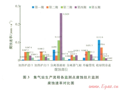 普光氣田從2009年10月投產(chǎn)至今,掛片數(shù)據(jù)顯示集輸和凈化系統(tǒng)腐蝕處于較低水平,整體受控(圖3),集輸站場(chǎng)內(nèi)管線和集輸管道平均腐蝕速率基本控制在0.076 mm/a以內(nèi)。其中集輸系統(tǒng)腐蝕較為嚴(yán)重的部位集中在:集氣站場(chǎng)計(jì)量分離器氣相和液相部位、收球筒旁通、計(jì)量匯管(生產(chǎn)匯管)集輸管道低洼處等存在積液和沉積物的位置。