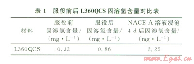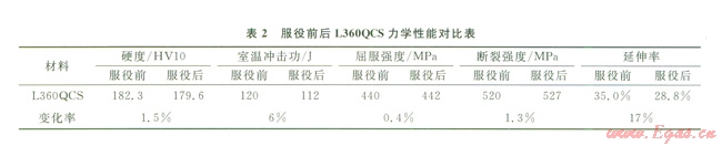 集氣站內(nèi)管道運(yùn)行l年后,截取站內(nèi)管道進(jìn)行力學(xué)性能測(cè)試,確定其性能變化情況。將運(yùn)行后的管材進(jìn)行NACE的標(biāo)準(zhǔn)HIC和SSC試驗(yàn),均未出現(xiàn)開裂。對(duì)比測(cè)量服役前后以及NACE A溶液浸泡后材料內(nèi)固溶氫含量發(fā)現(xiàn)(表1),服役后管材固溶氫含量雖有所增加,但遠(yuǎn)小于在NACE A溶液腐蝕4 d以后管材內(nèi)的固溶氫含量。說(shuō)明即使在高含硫工況條件下,氫滲透也遠(yuǎn)未達(dá)到飽和,管材氫損傷情況不嚴(yán)重。