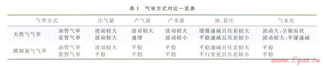 氣舉氣源主要有膜制氮?dú)夂吞烊粴?/font>[7]。鄰井有高壓氣的井選天然氣氣舉,鄰井沒有高壓氣的井選擇膜制氮?dú)鈿馀e。膜制氮?dú)鈿馀e比天然氣氣舉在注氣量、產(chǎn)氣量、產(chǎn)水量等方面更平穩(wěn)(表1)。