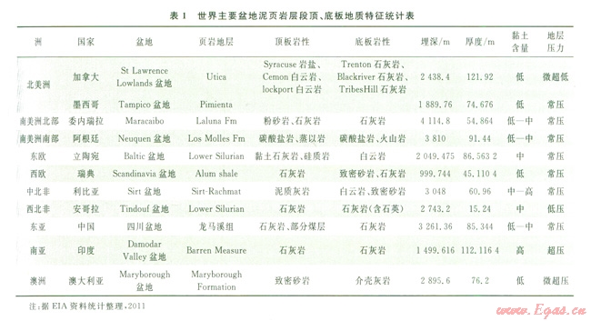 筆者通過文獻(xiàn)調(diào)研[5],對全球主要盆地含氣泥頁巖層段(系統(tǒng))頂、底板的地質(zhì)特征進(jìn)行了統(tǒng)計(jì)。結(jié)果顯示(表1),世界范圍內(nèi)主要盆地頁巖地層頂、底板巖性以致密的泥頁巖、膏泥巖、膏鹽層、石灰?guī)r、白云巖、火山巖、煤層等為主,屬于非滲透或低滲透巖層。其埋深范圍從l