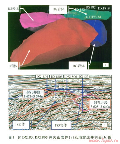 同樣,對(duì)地質(zhì)資料分析表明(圖5),DX183井試采井段屬“183”次火山巖體,而DX1805井試采井段屬“18”次火山巖體,可以進(jìn)一步證實(shí)DX1183、DX1805試采井段不連通。
