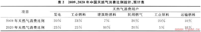 中國天然氣下游市場用戶主要集中在發(fā)電、民用、工業(yè)燃料、建筑物燃料、交通運輸燃料、工業(yè)原料等6大領域。2009、2020年中國天然氣消費比例統(tǒng)計、預計情況如表2所示[5]。