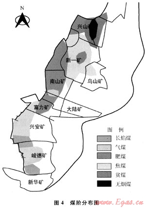 例如峻德、興安礦區(qū)主要為氣煤和長(zhǎng)焰煤,興安北部的富力、大陸、南山礦變?yōu)榉拭?,至新一礦深部、鳥山區(qū)變?yōu)榻姑?,再向北分布有貧煤和無(wú)煙煤(圖4)。因此煤變質(zhì)程度較高的南山、新一礦煤層瓦斯含量相應(yīng)增高,使得礦井瓦斯涌出量較大,屬高瓦斯突出礦區(qū)。