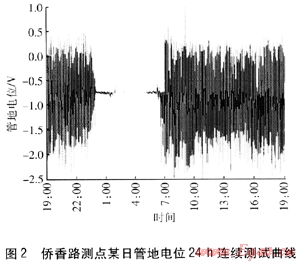 綜合上述調(diào)查內(nèi)容,完成了《僑香路燃氣管道雜散電流干擾腐蝕控制預(yù)備性測試報告》。圖2是測試報告中的某日管地電位24h連續(xù)測試曲線。