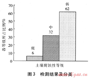 對(duì)埋地鋼管沿線的土壤腐蝕性采用等距法檢測,儀器采用ZC-8型土壤電阻率測量儀,共測量99處。其土壤電阻率范圍為15.08~207.37Ω·m,檢測結(jié)果及分類見圖3。