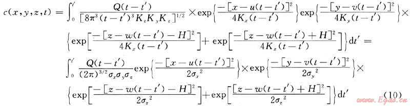 根據(jù)動態(tài)泄漏率不定常的特點,以氣體動力學理論和湍流擴散微分方程為基礎,結(jié)合相應的初始條件和邊界條件,利用格林函數(shù)進行推導,可得綜合擴散模型格林函數(shù)為: