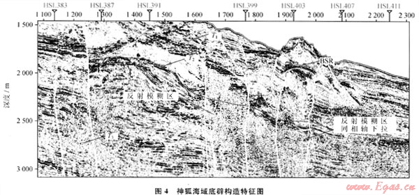 底辟構(gòu)造和天然氣水合物的形成與運(yùn)移聚集也有密切的關(guān)系,底辟構(gòu)造由地球深部物質(zhì)上拱或刺穿到淺部產(chǎn)生,在形成過程中會(huì)引起構(gòu)造側(cè)翼和頂部沉積層的傾斜和破裂,促使流體的排放,因而對(duì)水合物的形成十分有利。大量的調(diào)查資料顯示[14~15]:珠江口盆地白云凹陷中心有大量底辟群的存在,在神狐海域前期調(diào)查中,識(shí)別出了5個(gè)泥底辟異常反射體,其中4個(gè)位于白云凹陷內(nèi)。這些識(shí)別出來(lái)的底辟構(gòu)造在高分辨率地震剖面上表現(xiàn)特征主要為地震反射模糊區(qū)(帶),橫向上反射同相軸的連續(xù)性變差或錯(cuò)斷,內(nèi)部反射較雜亂,甚至為空白反射,局部見同相軸下拉現(xiàn)象;其兩側(cè)、頂部常見亮點(diǎn)振幅異常,白云凹陷北坡鉆井已揭示這種亮點(diǎn)與氣層存在良好對(duì)應(yīng)關(guān)系。因此,推斷這種反射模糊區(qū)應(yīng)為流體作用的結(jié)果(圖4)[16]。底辟構(gòu)造的存在說(shuō)明凹陷中心曾經(jīng)孕育著高壓、超壓系統(tǒng)。由于現(xiàn)今地層具有正常壓力,這說(shuō)明超壓的累積和釋放與深部烴源巖生烴及排烴有一定的關(guān)系。與底辟構(gòu)造密切伴生的大量亮點(diǎn)指示著沿底辟構(gòu)造的天然氣垂向輸導(dǎo),構(gòu)成了古近系油氣運(yùn)移到新近系 第四紀(jì)的成藏動(dòng)力系統(tǒng)。底辟構(gòu)造的發(fā)育在不同深度形成了上覆拱張,上覆地層產(chǎn)生了高角度的斷裂和垂向裂隙系統(tǒng),構(gòu)成流體運(yùn)移的另一個(gè)通道。