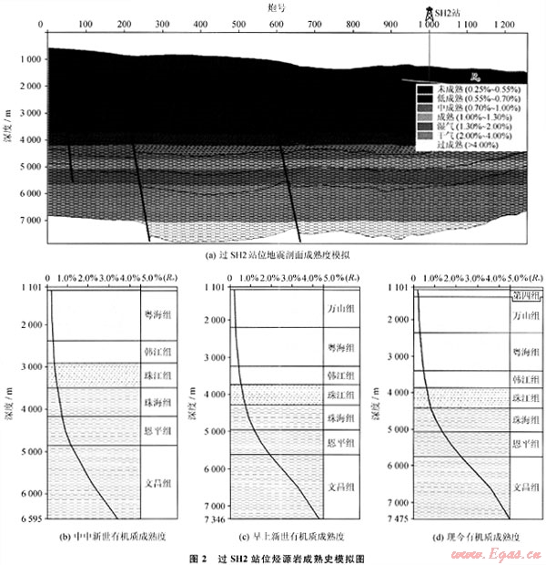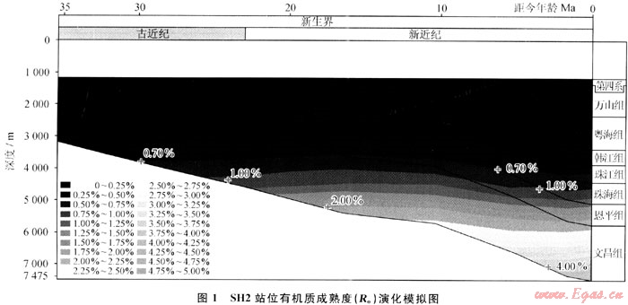 2007年4~6月,廣州海洋地質(zhì)調(diào)查局在神狐海域研究區(qū)內(nèi)實(shí)施了天然氣水合物鉆探,先后在3個(gè)站位成功鉆獲了天然氣水合物實(shí)物樣品,對(duì)其中的SH2站位沉積物樣品中的氣體進(jìn)行的氣相色譜分析的結(jié)果顯示[10]:CH4的體積分?jǐn)?shù)占96%~99%,C2H6和C3H8的體積分?jǐn)?shù)很低,干燥系數(shù)(C1/C2)一般在數(shù)百至1000以上,為典型的干氣。SH2站位含水合物層的總有機(jī)碳含量平均值為0.43%,已達(dá)到了作為生物氣烴源巖的標(biāo)準(zhǔn),對(duì)SH2站位進(jìn)行有機(jī)質(zhì)成熟度的熱演化模擬(圖1),結(jié)果表明:淺部地層珠江組、韓江組、粵海組和萬(wàn)山組Ro值低于0.7%,多在0.2%~0.6%,處于未熟-低成熟的生烴門限附近,屬于良好的生物氣的烴源巖。這幾套層序厚度大,泥巖含量高,熱成熟低,有機(jī)質(zhì)豐度較高[11],其中,上中新統(tǒng)-第四系海相泥巖有機(jī)碳含量平均為0.22%~0.49%,且不同層位及層段均變化不大,第四系有機(jī)碳含量平均為0.22%~0.28%,上新統(tǒng)有機(jī)碳含量平均為0.30%~0.39%,上中新統(tǒng)有機(jī)碳含量平均為0.49%;上中新統(tǒng)-全新統(tǒng)海相泥巖生烴潛力(S1+S2)平均為0.13~0.32mg/g,與鶯歌海盆地大體一致。由此推測(cè),該區(qū)具備生成生物氣的巨大潛力。