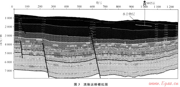 由于受區(qū)域構(gòu)造運(yùn)動(dòng),特別是新構(gòu)造運(yùn)動(dòng)的作用,神狐研究區(qū)內(nèi)斷裂構(gòu)造發(fā)育。斷層可分為北東、北西和北北西向3組,且均為正斷層,其中北東向斷層有明顯切割北西向斷層的趨勢(shì)。斷層活動(dòng)時(shí)間大致可分為晚中新世和上新世以來(lái)2個(gè)主要時(shí)期,晚中新世斷層以北西向?yàn)橹?,主要分布于研究區(qū)中北部,斷層大部分切割上中新統(tǒng),部分切穿上新統(tǒng),是研究區(qū)最主要斷層活動(dòng)時(shí)期;上新世以來(lái)活動(dòng)斷層以北東向?yàn)橹?,斷層活?dòng)強(qiáng)度小,但數(shù)量眾多。由于這些斷層貫通了下部氣源巖系與上部水合物形成的溫壓穩(wěn)定帶層系,改善了天然氣的垂向運(yùn)移條件,而斷層活動(dòng)時(shí)間又橫跨生氣和排氣高峰期,成為構(gòu)成流體運(yùn)移的一個(gè)主要通道。同時(shí),應(yīng)該注意到如果斷層過大,直通海底,會(huì)造成部分氣體的散失。從過SH2站位地震剖面流體運(yùn)移模擬結(jié)果來(lái)看(圖3),由于該處發(fā)育斷裂,直通海底,導(dǎo)致深部熱解氣源部分通過斷裂直通海底散失,未能有效運(yùn)移至水合物穩(wěn)定域,所以鉆井處熱解氣源對(duì)水合物貢獻(xiàn)較小。同時(shí)從圖中烴氣運(yùn)移方向分析,該處鉆遇的水合物主要為淺層生物成因氣通過橫向運(yùn)移至水合物穩(wěn)定域形成。