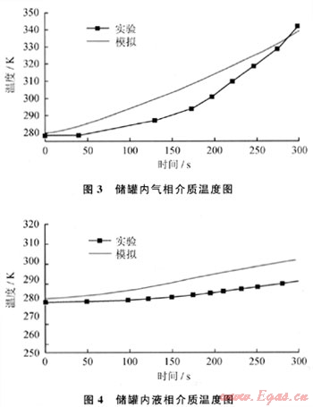 圖3、4分別為氣相介質(zhì)和液相介質(zhì)的溫度響應(yīng)過程,計算值與實驗值吻合較好,最大誤差分別為4.5%和4%。其中,氣相取距離儲罐頂部50mm處的介質(zhì)溫度,液相取距離儲罐底部200mm處介質(zhì)的溫度。由圖3和圖4對比可知,液相介質(zhì)的溫度升高較氣相介質(zhì)緩慢,300s內(nèi)氣相介質(zhì)和液相介質(zhì)的溫度分別升高了63K和11K。原因在于一方面蒸汽的比熱容遠(yuǎn)小于液相的[2];另一方面液相介質(zhì)過熱后會通過相變將熱量轉(zhuǎn)化到氣相,使得液相介質(zhì)本身儲存的熱量較少。