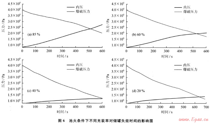 3) 池火作用下,LPG儲罐失效受到兩個因素控制,一是介質(zhì)溫度升高導(dǎo)致的儲罐內(nèi)介質(zhì)壓力升高,二是氣相區(qū)壁溫升高導(dǎo)致的強(qiáng)度下降。兩條曲線的交叉點即為儲罐的失效點。儲罐內(nèi)介質(zhì)的充裝率越高,儲罐失效時間越短。