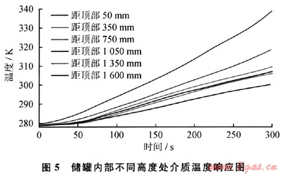 圖5所示為儲罐內(nèi)不同高度處介質(zhì)的溫度響應(yīng)規(guī)律??梢钥闯?,池火作用下儲罐內(nèi)部存在熱分層現(xiàn)象,溫度總體呈現(xiàn)上高下低的趨勢。本文所模擬的LPG儲罐的初始充裝率為72%,對應(yīng)的氣液分界面位于距儲罐頂部540mm處??梢?,氣相溫度明顯高于液相,且距離液面越遠(yuǎn)氣相溫度越高,說明氣相除了通過相變吸熱外,還通過氣相壁面吸收輻射熱量;另外,在距離儲罐頂部1350mm以下的液相區(qū),介質(zhì)溫度降低明顯,說明過冷液體區(qū)與液相分層區(qū)[2]的分界面可能位于此處附近。