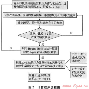 應用上述的溫度模型結合Beggs-Brill方法計算管線內(nèi)溫度、壓力分布時,由于只涉及產(chǎn)出氣的相對密度,因此預測管線內(nèi)天然氣水合物能否生成時,采用經(jīng)驗圖解法與溫度壓力模型進行耦合[7],從而得到天然氣水合物生成條件預測理論模型,并編制了相應的計算程序,計算程序流程如圖2所示。