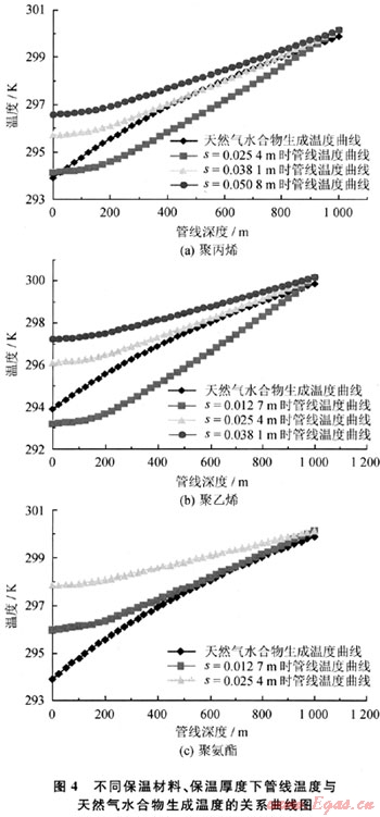 聚丙烯、聚乙烯和聚氨酯作為3種基本的保溫材料被廣泛應用在石油天然氣工業(yè)的管道設計中[4],其熱傳導系數(shù)分別為0.35W/m·K、0.22W/m·K和0.12W/m·K(考慮一定的吸水率),不同保溫材料、保溫厚度下的管線溫度與天然氣水合物生成的溫度關系圖見圖4。