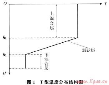 值得注意的是深水中垂向溫度分布較陸地復雜得多[5]:深水中,隨著深度的增加環(huán)境溫度是逐漸降低的,和陸地不同,深水垂向溫度呈現(xiàn)不規(guī)則的變化,一般可以擬合為多種垂向溫度分布結構;陸上垂向溫度分布隨季節(jié)變化很小,而深水環(huán)境中則不同,甚至分布結構也會發(fā)生變化,因此,采用最常見的T型分布結構進行計算。所謂T型結構即呈現(xiàn)為上面為混合層,中間為溫躍層,下面為混合層的3層結構,躍層上、下界點明顯,如圖1所示。