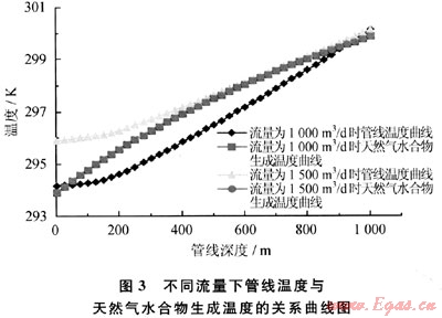 由圖3可以看出,隨著壓力的增加,天然氣水合物的生成溫度逐漸增高。流量增大后,管線溫度曲線明顯上移,且受外界環(huán)境溫度的影響減弱,這是因為流速加快后流體與外界環(huán)境之間的熱交換時間減少所致;而此時天然氣水合物生成溫度曲線卻有輕微的下移,這是因為流量增大后,摩擦損失增大,導致管線內(nèi)對應點的壓力減少。也就是說,流量增大導致2條曲線向相反的方向發(fā)展,因而,可以通過調(diào)整流量來實現(xiàn)管線的正常傳輸。在上例中,流量不能低于1500m3/d,這樣才能保證該管線的正常傳輸。