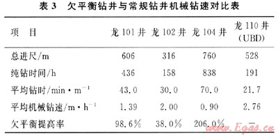 3) 龍110井的現(xiàn)場試驗表明,沙一段至馬鞍山組層段開展欠平衡鉆井,能有效地提高機(jī)械鉆速,且與鄰井龍104井的常規(guī)鉆井相比,最高可達(dá)206%。