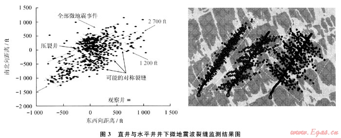 采用上述方法,通過井下微地震波測試,證實頁巖氣直井滑溜水大規(guī)模壓裂和水平井分簇射孔分段壓裂形成網(wǎng)絡裂縫,提高了壓裂改造效果(圖3)。