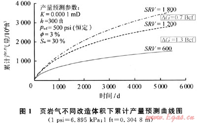 頁巖氣儲層滲透率超低,厚度大,天然裂縫發(fā)育,氣體主要以吸附態(tài)吸附在有機質表面,常規(guī)改造形成單一裂縫很難獲得好的增產效果。數(shù)值模擬研究表明[3],頁巖氣儲層改造的體積(SRV,106ft3;1ft3=0.028317m3,下同)越大,壓后增產效果越好(圖1)。但要實現(xiàn)體積改造,除地層要具備體積壓裂的基本條件外,壓裂改造工藝方法也十分關鍵。