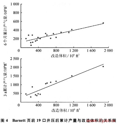 在Barnett頁巖19口有井下微地震監(jiān)測資料的井,改造后的體積與壓后6個月和3a累計產量的比較曲線見圖4。由圖4可見:19口井的壓裂改造體積在5.3×106~52.7×106m3,且壓后4個月的累計產量隨著改造體積的增加而增加,壓后3a增加的幅度更大,這充分說明改造體積對頁巖氣壓后產量的重要作用。