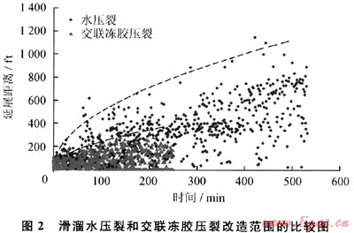 3) 敏感性不強,適合大型滑溜水壓裂。弱水敏地層,有利于提高壓裂液用液規(guī)模,同時使用滑溜水壓裂,滑溜水黏度低,可以進入天然裂縫中,迫使天然裂縫擴展到更大范圍,大大擴大改造體積。圖2為滑溜水壓裂和交聯(lián)凍膠壓裂改造范圍的比較曲線。