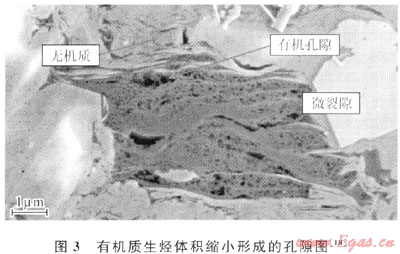 目前有研究認(rèn)為,頁巖中的孔隙以有機質(zhì)生烴形成的孔隙為主(圖3)。據(jù)Jarvie等人研究,有機質(zhì)含量為7%的頁巖在生烴演化過程中,消耗35%的有機碳可使頁巖孔隙度增加4.9%[18]。有機微孔的直徑一般為0.01~1μm。