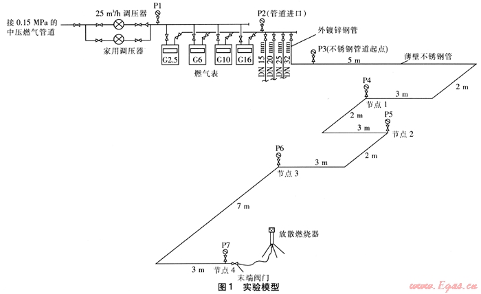 實驗模型見圖1。根據低壓燃氣管道的流量計算公式可知,當管徑一定時,管道中的燃氣流量只與計算起點、終點間的壓力降有關,與計算終點之后管道內的壓力變化情況無關。