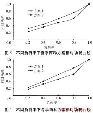 不同負荷率下冬季兩種方案相對功耗曲線見圖4,以冬季100%負荷率下的功耗作為計算基礎(chǔ)。由圖4可知,冬季,方案1的相對功耗與負荷率近似成線性關(guān)系。方案2的相對功耗在負荷率為0.8~1.0范圍內(nèi)變化非常劇烈,在負荷率0.2~0.8范圍內(nèi)二者近似成線性關(guān)系。