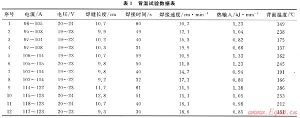 研究管道背溫,有利于計算管道壁厚一定時的焊接壓力。如焊接溫度過高,相應(yīng)溫度下管道材料的屈服極限數(shù)值降低,熔池下未融的面積不能承受管道內(nèi)壓,導(dǎo)致燒穿管道。一般墊層焊接電流控制在100~120A之間,背溫試驗的材質(zhì)為X65,管道規(guī)格為Φ610mm×12.7mm。
