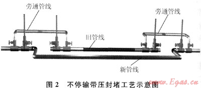 依據(jù)輸氣量要求,采用DN300mm旁通線作為臨時輸送管線,旁通管線預(yù)制完成后進行超聲波無損探傷。驗收合格后對旁通線充氮氣試壓.旁通線試壓合格后,導(dǎo)通旁通管線。安裝封堵器,進行封堵作業(yè)。