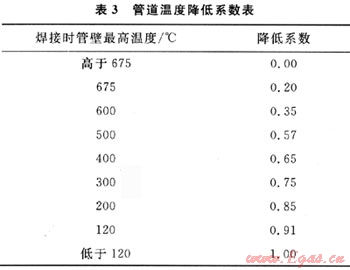 管道溫度降低系數(shù)見表3(適用于管道最大承載壓力)。