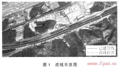 深圳市擬建的地鐵5號線塘朗段與平南鐵路用地沖突,平南鐵路須向南平移。但鐵路平移將與廣東LNG塘朗段管道發(fā)生沖突,為保證LNG管道的安全運行、周邊在建各項目的正常施工及建成后的安全,深圳市政府及有關(guān)方面要求對該段管道進行遷移。該段管線為廣東LNG支干線的一部分,主要向深圳工業(yè)及民用用戶供氣,已于2006年竣工并投運。管道設(shè)計壓力為9.2MPa,規(guī)格為Φ610mm×12.7mm,材質(zhì)為X65鋼,需改線遷移的管道長720m。鑒于經(jīng)濟和社會影響,改線管道建成后,需與舊管線實施不停輸帶壓對接。改線示意圖見圖1。