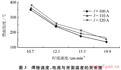 試驗步驟:將試件放置在水平位置,分別調(diào)節(jié)電流到100A、110A、120A,進行焊接,測量背面溫度,數(shù)據(jù)見表1。焊接速度、電流與背面溫度的關(guān)系如圖3所示。