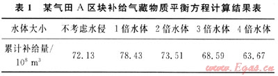根據(jù)圖3采用常規(guī)物質(zhì)平衡法計算得到A區(qū)塊的動態(tài)控制儲量為475.88×108m3,其動態(tài)控制儲量遠遠大于A區(qū)地質(zhì)儲量,出現(xiàn)“超百”現(xiàn)象,不符合常理。分析認為:該區(qū)塊與B區(qū)塊間存在相互補給和外溢漏失的情況,B區(qū)塊和A區(qū)塊相鄰并由一條斷層分隔,B區(qū)塊后期加鉆1口井測壓顯示地層壓力已降至27MPa,說明該區(qū)塊已被動用(即產(chǎn)生了外溢)。應用上述建立的補給氣藏物質(zhì)平衡方程可以計算收益區(qū)塊A區(qū)塊補給量的大小,其計算結(jié)果見表1。