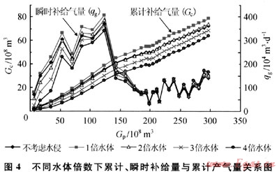 由圖4所預測的瞬時補給氣量顯示,氣田開采初期僅有A區(qū)塊開采,采氣速度迅速上升到4.5%,瞬時補給量(qg)也快速上升達到400×104m3/d;隨后由于氣田其他區(qū)塊投入開采,適當調(diào)低了A區(qū)塊的采氣速度(維持在2.5%),瞬時補給氣量也降到120×104m3/d左右。采氣速度大小直接關系著地層壓力的降低幅度,因此,區(qū)塊間的壓力差是影響氣竄量大小的重要因素。