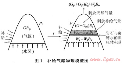 1936年,Schilthus首先推導出體積物質(zhì)平衡方程,此方法可以簡單有效的估算地層內(nèi)原始氣體和氣藏枯竭各階段天然氣儲量,是油氣藏動態(tài)分析的一種標準的油氣藏丁程工具。筆者借鑒物質(zhì)平衡原理[2,13~15],將氣藏模擬為單獨儲罐體,并考慮有外來天然氣及水體通過薄的可滲透邊界不斷流入氣藏的情況下建立新的補給氣藏物理模型(圖1)。