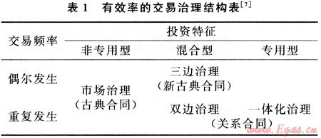在選擇和設(shè)計交易治理機制的時候,交易者面臨“有限理性困境”和“機會主義威脅”兩者之間的持久沖突[6]。交易成本理論提出了有效的交易治理模式:市場治理(非專用型的,通過市場自由選擇)、一體化治理(專用性很強,層級管理的效率最高)、關(guān)系合同治理(介于兩者之間的關(guān)系合同),如表1所示。