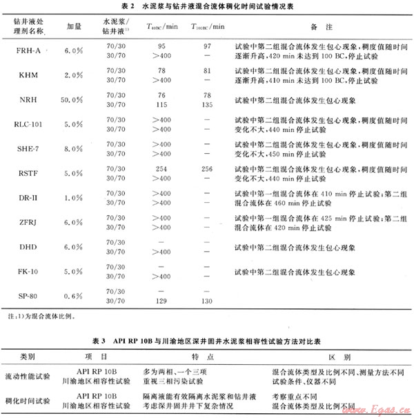 表1的試驗(yàn)結(jié)果表明,在該試驗(yàn)條件下水泥漿與上述兩類鉆井液會(huì)發(fā)生污染,混合流體較純水泥漿稠化時(shí)間最高縮短35%,在施工中應(yīng)引起重視。水泥漿與鉆井液接觸污染問(wèn)題是一個(gè)互相污染的過(guò)程,判斷污染源可從2個(gè)方面出發(fā):①根據(jù)混合流體的流變性能判別,如果混合流體流動(dòng)度低則判別為鉆井液抗鈣性差,是由于鉆井液中的黏土顆粒聚結(jié)造成的,即是水泥漿污染了鉆井液的表現(xiàn)。如果混合流體的流變性能保持良好則說(shuō)明鉆井液的抗鈣能力較強(qiáng),水泥漿對(duì)鉆井液基本沒(méi)有不良影響;②根據(jù)混合流體的稠化時(shí)間來(lái)判別,如果混合流體稠化時(shí)間較水泥漿稠化時(shí)間縮短,說(shuō)明是水泥漿受到鉆井液污染后帶來(lái)緩凝劑失效造成的。