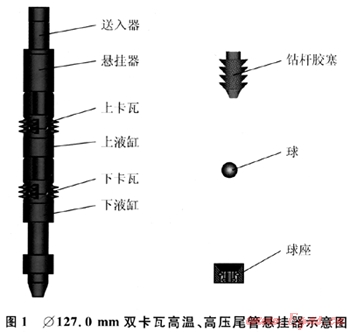 Φ127.0mm雙卡瓦高溫、高壓尾管懸掛器主要由送入器、懸掛器(含上下液缸和卡瓦)、球、球座和鉆桿膠塞組成(圖1)。