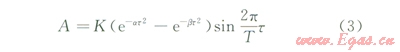 式中A為子波的瞬時(t)振幅,K為單元子波的振幅倍數(shù),對于反射子波,如果入射子波為一個單元子波,那么K就是反射系數(shù),這時K是一個分數(shù),T是振蕩的主周期,(e-at2-e-bt2)為子波包絡(luò),其中t是從包絡(luò)起點t0開始計算的時間,t0可以是從激發(fā)開始計算的時間,也就是記錄上的波至時間,子波包絡(luò)還可以寫成: