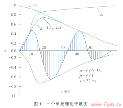 從圖l上可以看出,子波包絡(luò)在時間tm上有極大值`am(頂桿表示絕對值),將包絡(luò)曲線分成前部上升和后部下降的兩個半枝。對后半枝而言,當t稍大于tm時,包含b值的e-gt2一項很快接近于零[式(4)],這時`A≈Ke-at2。
