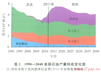 當(dāng)人們還在深入探討頁巖氣革命對美國能源獨(dú)立,以及對地緣油氣、經(jīng)濟(jì)和政治的影響時,美國原油的產(chǎn)量上升卻更令人驚詫。但在有關(guān)文獻(xiàn)上都強(qiáng)調(diào),在傳統(tǒng)常規(guī)石油(包括陸上、海上和阿拉斯加)產(chǎn)量總體上下降的背景上,使美國改變了數(shù)十年石油產(chǎn)量降勢[5]的因素是致密油產(chǎn)量的快速增加(圖2)。在這類文獻(xiàn)中所指的致密油實(shí)際上包括了頁巖油和致密砂巖油[6],顯然使用的是筆者在本文開始時就指出的廣義的致密油氣概念。在有關(guān)文獻(xiàn)的文圖中一提到具體的產(chǎn)地和產(chǎn)層,就顯示它們大部分都位于研究者熟知的頁巖氣產(chǎn)區(qū)和層系內(nèi)。實(shí)際上,即使在本世紀(jì)初伴隨頁巖氣增產(chǎn),以凝析油為主的頁巖油產(chǎn)量就已經(jīng)在不斷增加著(如2004年日產(chǎn)11.1×l04桶,l桶=l58.9L,下同),這就促使美國的石油產(chǎn)量從2006年日產(chǎn)684.1×104桶的最低點(diǎn)開始了具歷史性意義的轉(zhuǎn)降為升,2007年僅增產(chǎn)0.9%,而2008和2009年的平均年增率為2.3%。在美國開始更加重視頁巖油的2009年,所統(tǒng)計的致密油的日產(chǎn)量就達(dá)25×104桶;到2011年為日產(chǎn)90×104桶,增加了2.6倍,從而使這兩年美國石油產(chǎn)量年增率達(dá)4.6%,該年致密油產(chǎn)量占全美石油總產(chǎn)量的ll.5%。顯然,美國致密油產(chǎn)量和石油總產(chǎn)量都呈加速增長之勢。由于產(chǎn)量基數(shù)大,使得近年來美國石油年增加量居世界之首。按照EIA的初步統(tǒng)計,2012年上半年致密油產(chǎn)量同比增加9.7%?!?span lang="EN-US">BP2013年度全球能源展望》進(jìn)一步表明:美國2012年原油總產(chǎn)量達(dá)3.949×108t,增長49.2×l06t,年增率達(dá)l4.2%。“大部分新增產(chǎn)量來自頁巖資源”。全球按石油年增率排序列在美國后4位的伊拉克、科威特、加拿大、卡塔爾依次為ll.5%、9.2%、7.2%、6.5%;總產(chǎn)量居世界前兩名的沙特阿拉伯和俄羅斯年增率分別僅為3.91%、l.5%;美國2012年石油增產(chǎn)量占全球增產(chǎn)量的49.2%[3]。據(jù)EIA預(yù)測,2020年美國致密油日產(chǎn)量可達(dá)300×104桶,可占全美石油總產(chǎn)量的36%;進(jìn)而推測2017年后美國石油產(chǎn)量將有超過沙特阿拉伯的可能。直接受惠于美國的技術(shù)和管理,加拿大2011年致密油日產(chǎn)量為l9×104桶,約占其石油總產(chǎn)量的5.4%;預(yù)測2035年加拿大原油日產(chǎn)量可達(dá)50×104桶。EIA還預(yù)測,2020年中國頁巖油日產(chǎn)量將可能超過20×104桶,阿根廷的內(nèi)烏達(dá)盆地頁巖油日產(chǎn)量可達(dá)15×104桶[7]。
