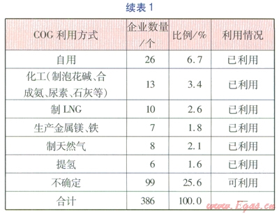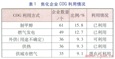 前述分析顯示,目前中國(guó)焦化企業(yè)中將COG用于外供(用途不確定)、城市燃?xì)庖约澳壳安淮_定利用情況的l67家企業(yè)是COG可利用資源,這些企業(yè)主要分布在山西、河北、山東,分別有53、40、19家企業(yè);少量分布在河南、陜西、內(nèi)蒙古等地,分別有11、7、6家企業(yè)。2011年我國(guó)焦炭產(chǎn)量前三名省份為山西、河北、山東,焦炭產(chǎn)量分別為0.9×108、0.6×108、0.4×108t。從地域分布上看,COG可利用資源企業(yè)分布情況與焦炭產(chǎn)量分布情況相同,前三名均鎖定在山西、河北、山東,這也印證了COG是焦炭企業(yè)的重要副產(chǎn)品的特點(diǎn)。