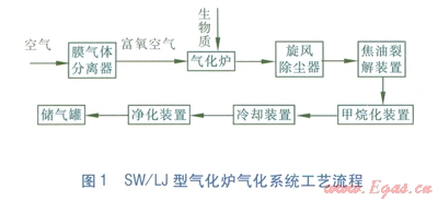 SW/LJ固定床反火型生物質(zhì)氣化爐是生物質(zhì)氣化集中供氣系統(tǒng)的核心,該氣化爐主要功能是把生物質(zhì)等固體原料轉(zhuǎn)換成氣體燃料。具體工藝流程見圖l。生物質(zhì)原料由爐頂送入氣化爐,同時,加入由膜氣體分離器產(chǎn)生的富氧空氣,經(jīng)過熱解氧化和還原反應(yīng),產(chǎn)生的燃氣先進入旋風(fēng)除塵器分離出燃氣中較大的顆粒飛灰,然后進入焦油裂解裝置,對焦油進行深度裂解;而后,生物質(zhì)燃氣進入甲烷化裝置進行反應(yīng);之后再經(jīng)過冷卻裝置使氣體迅速降至室溫;最后,經(jīng)凈化裝置過濾即可得到清潔燃氣,成品燃氣進入儲氣罐儲存。