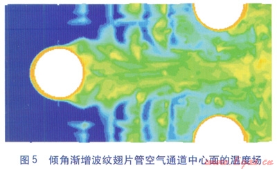 空氣進(jìn)口速度為4m/s時(shí),兩種波紋翅片管空氣通道中心面的溫度場(chǎng)分別見圖4、5。由圖4、5可知,兩種波紋翅片管的溫度分布都很紊亂且成狹長帶狀。在迎風(fēng)側(cè),傾角漸增波紋翅片管空氣通道中心面空氣溫度上升得較快,且出口溫度高于均勻傾角波紋翅片管。這是由于傾角漸增波紋翅片結(jié)構(gòu)加強(qiáng)了氣流擾動(dòng),從而強(qiáng)化了換熱。兩種波紋翅片管的共同點(diǎn)是:在迎風(fēng)側(cè),溫度場(chǎng)分布稠密,溫度上升較快,換熱較強(qiáng)烈;在背風(fēng)側(cè),溫度場(chǎng)分布稀疏,溫度變化較小,換熱較平緩。