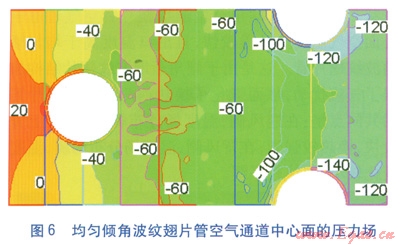 空氣進(jìn)口速度為4m/s時(shí),兩種波紋翅片管空氣通道中心面的壓力(表壓)場(chǎng)分別見圖6、7,圖中數(shù)值單位為Pa。由圖6、7可知,兩種波紋翅片管的壓力分布均比較紊亂。傾角漸增波紋翅片管空氣通道中心面的壓力降要大于均勻傾角波紋翅片管,且隨著翅片傾角的增大,等壓線分布更加稠密。原因是傾角漸增波紋翅片結(jié)構(gòu)對(duì)流體的阻滯和擾動(dòng)作用都較大,阻力比均勻傾角波紋翅片管大。