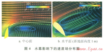 下面對扇形水幕的參數(shù)進行研究,包括噴水量和水幕和擴散源之間的間隔,這二者是影響水幕阻擋效果的主要因素。圖7顯示了不同水流量下,水幕對氣體擴散的影響,在相同的大氣條件下,水流量越大,形成的水幕尺寸也就越大。當(dāng)扇形水幕流量為l.32m3/min,壓力1035kPa時,水幕高度為11.4m,寬度45.6m,LNG蒸發(fā)氣體下風(fēng)向擴散的安全距離為8.3m。