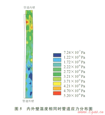 管道輸氣過(guò)程中受到上覆土層壓力、內(nèi)部氣體壓力及溫度作用[14-17]。由于管道外壁防腐層不具有保溫作用,外壁接觸地層,溫度部分傳導(dǎo)進(jìn)地層造成熱量損耗,管道內(nèi)外壁將產(chǎn)生溫差。氣候條件及輸氣距離的變化也會(huì)造成地層和管道外壁熱傳導(dǎo)效應(yīng)的變化,管道內(nèi)外壁溫差逐漸增加。圖4為內(nèi)外壁存在溫差下管道溫度分布特征圖,圖5為內(nèi)外壁溫度相同時(shí)管道應(yīng)力分布圖。