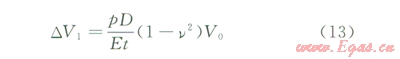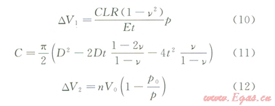 實(shí)踐中,對(duì)于式(10),由于徑向?yàn)楣艿辣诤穹较?,?duì)于大口徑薄壁管,擘厚變化引起的管道體積變化較小,以規(guī)格為l219×22mm規(guī)格的管道為例,經(jīng)測(cè)算,僅為DVl的5%,若考慮空氣、水的壓縮性,該比例還將大大降低。因此,本文將該壁厚變化引起的體積變化忽略,得到DVl表達(dá)式為: